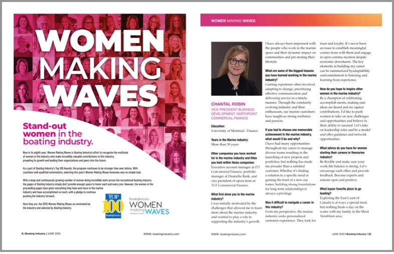 Northpoint’s VP of Business Development/Canada Chantal Robin was tapped to the Boating Industry “Women Making Waves” Class of 2025 and received her award at the Top 100 Elevate Summit in Orlando in January. As one of a select group of women leaders throughout North America chosen for this prestigious honor, Chantal brings a wealth of experience and enthusiasm to her role which has positively impacted the success of Northpoint Commercial Finance throughout Canada, and the customers she serves.